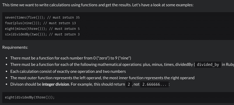 CodeWars Calculating with Functions Calculating with Functions 알고리즘 문제는 숫자함수와 계산함수 두종류를 이용하여 1의 자리 숫자 두개를 계산 한 값을 return…